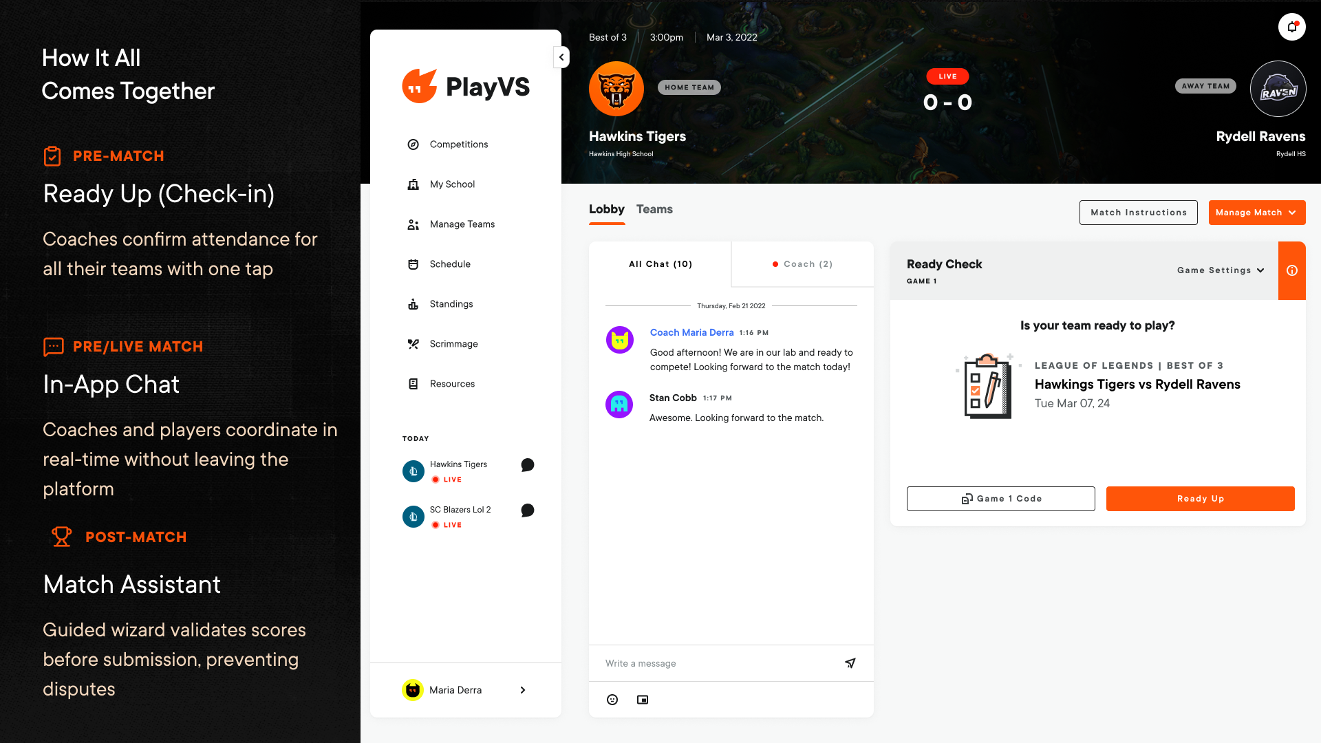 PlayVS runs on coaches. They're the ones responsible for getting teams to matches, managing rosters across multiple teams, and keeping students engaged week to week. But the match day experience was fragmented — check-in lived in one place, coordination happened on Discord and email, and score reporting was a separate manual flow with no validation. If any single step broke down, the match didn't happen. At 50%+ forfeit rates, that was a real problem.