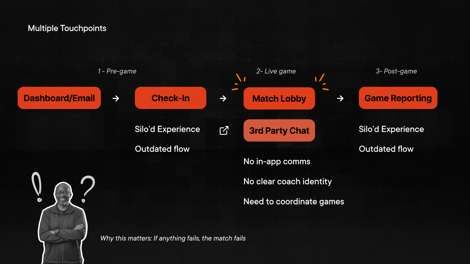 This wasn't a single broken feature — it was a broken sequence. Pre-match, coaches had no clear confirmation that their team was actually checked in. During the match, there was no in-platform way to reach the opposing coach. Post-match, score disputes required CS intervention because either team could submit whatever they wanted. Three separate failure points, each one capable of killing a match on its own.