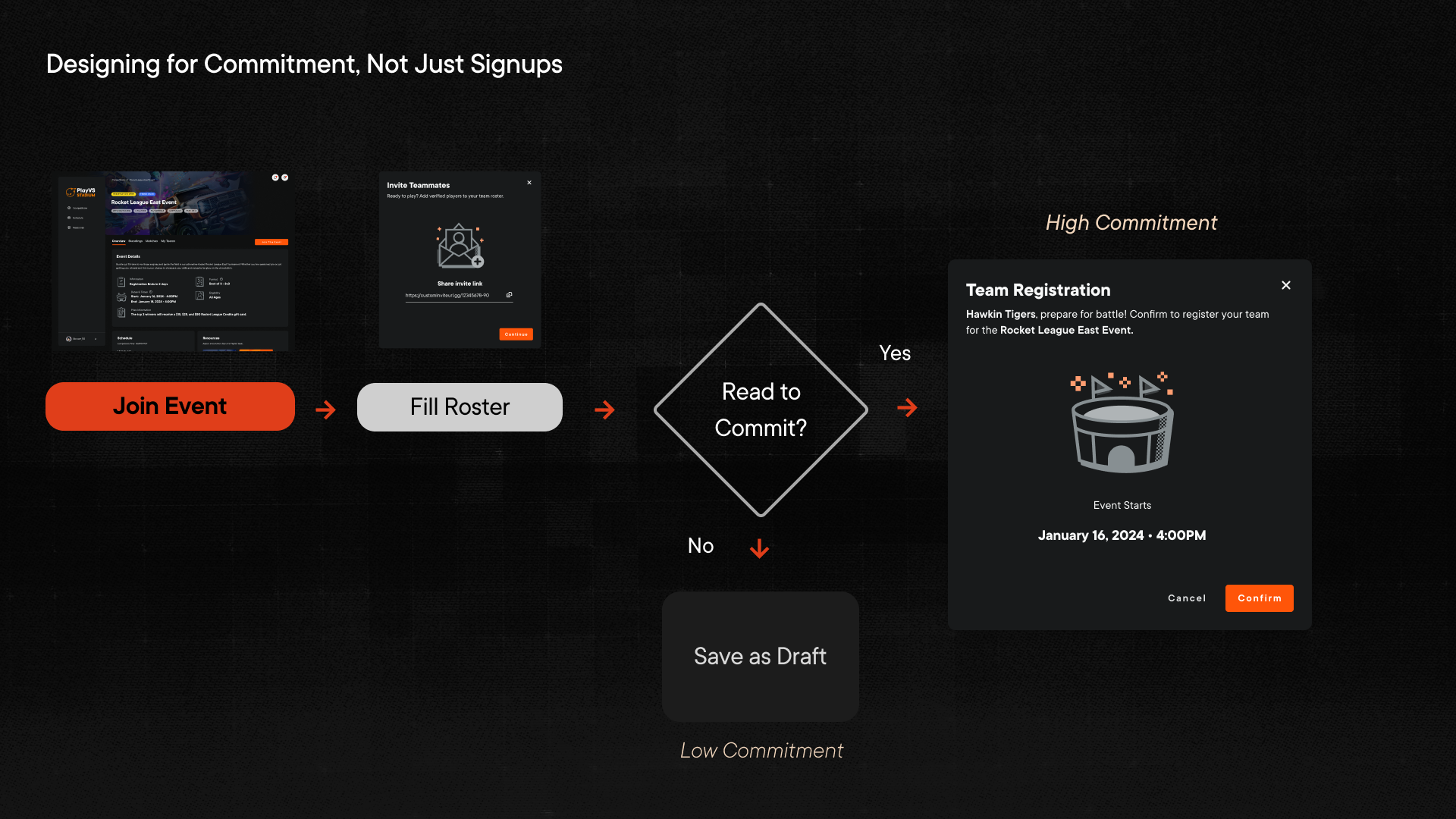 Open tournaments attract casual interest. That means no-shows, forfeits, and a bad experience for players who actually show up. I designed a two-step commitment model — join and fill your roster first, then confirm registration second. The friction was intentional. Only serious teams complete both steps.