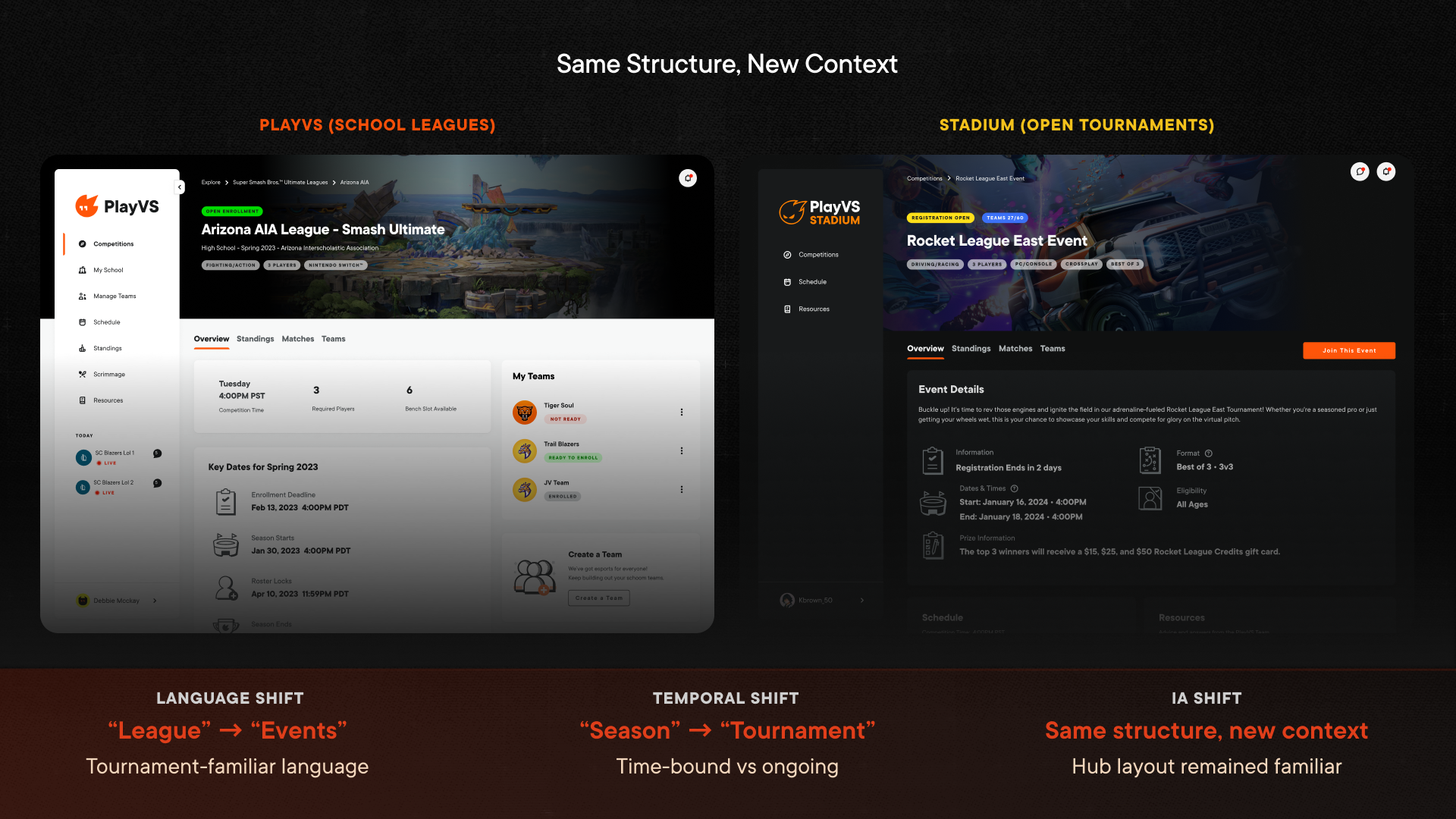 This wasn't a reskin. The entire information architecture had to shift — from school → league → season → rankings to individual → event → bracket → winner. Same underlying platform, fundamentally different user model. We couldn't rebuild from scratch, so the real question was: what do we adapt, and what do we build new?